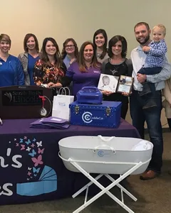Pictured left to right are: “Madison’s Miracles” founder Christina Stamper with Dustin and Tasha Ruholl, holding son, Drasen, and photo of baby Daniel. The SBL Women & Children’s Center nursing staff joins the group in the second photo.