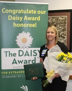 Sarah Bush Lincoln has joined more than 2,700 healthcare facilities by becoming a DAISY Award hospital partner. During the award presentation, Murray received a certificate, a DAISY Award pin and a unique, hand-carved serpentine stone sculpture from Zimbabwe, entitled, “A Healer’s Touch.”