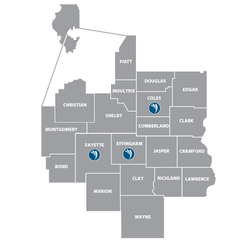 Services are provided to area residents in their homes in a 20-county area including Bond, Christian, Clark, Clay, Coles, Crawford, Cumberland, Douglas, Edgar, Effingham, Fayette, Jasper, Lawrence, Marion, Montgomery, Moultrie, Piatt, Richland, Shelby and Wayne counties.